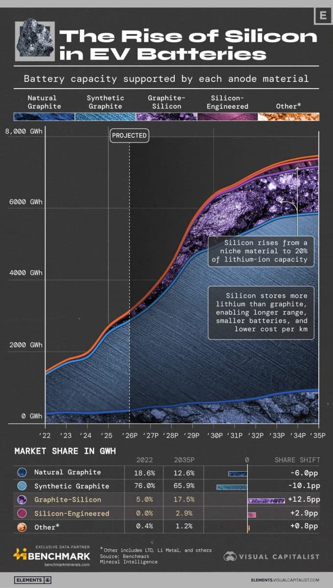 Однако сегодня кремний становится мощной альтернативой. Эта инфографика показывает, как, по прогнозам, будет расти доля анодов с содержанием кремния в аккумуляторах электромобилей вплоть до 2035 года.