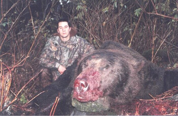 Медведь-людоед,убит охотником. Вес 750кг. и рост 4.15м. Лет 10 назад в Канаде. Потребовалось 11 пуль из винтовки, правда калибр мелкий около 6 мм. Он до этого съел двух туристов, они попали в него 4 раза из пистолета, но им это не помогло.