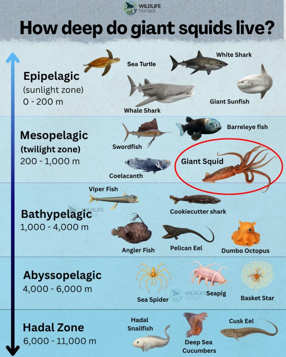 Мезопелагиаль, расположенная на глубине до 1000 метров, — дом для гигантского кальмара. Многие жители этой зоны проводят там световой день, ночью поднимаясь наверх. Это позволяет им питаться планктоном в фотической зоне, не попадая на глаза хищников. Одна из особенностей многих обитателей этого слоя — большие глаза, способные улавливать свет, который примерно в 100 раз слабее видимого людьми.