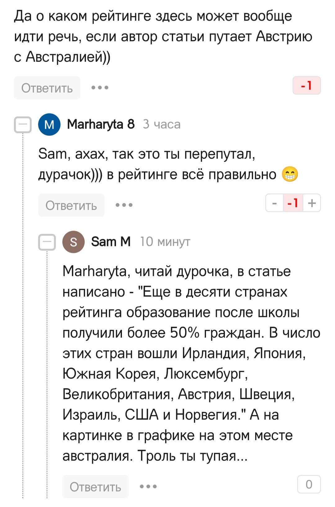 Marharyta, читай дурочка, в статье написано - "Еще в десяти странах рейтинга образование после школы получили более 50% граждан. В число этих стран вошли Ирландия, Япония, Южная Корея, Люксембург, Великобритания, Австрия, Швеция, Израиль, США и Норвегия." А на картинке в графике на этом месте австралия. Троль ты тупая...