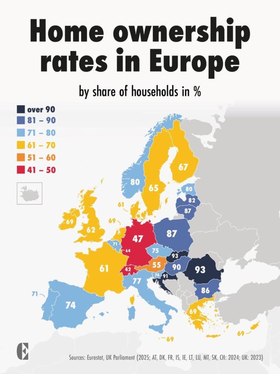Доля собственников жилья в Европе сильно различается в зависимости от страны. В среднем жители Центральной и Восточной Европы владеют собственной недвижимостью примерно на 30% чаще, чем жители Западной Европы. Это обусловлено не только уровнем доходов, но и историческими, а также культурными факторами.