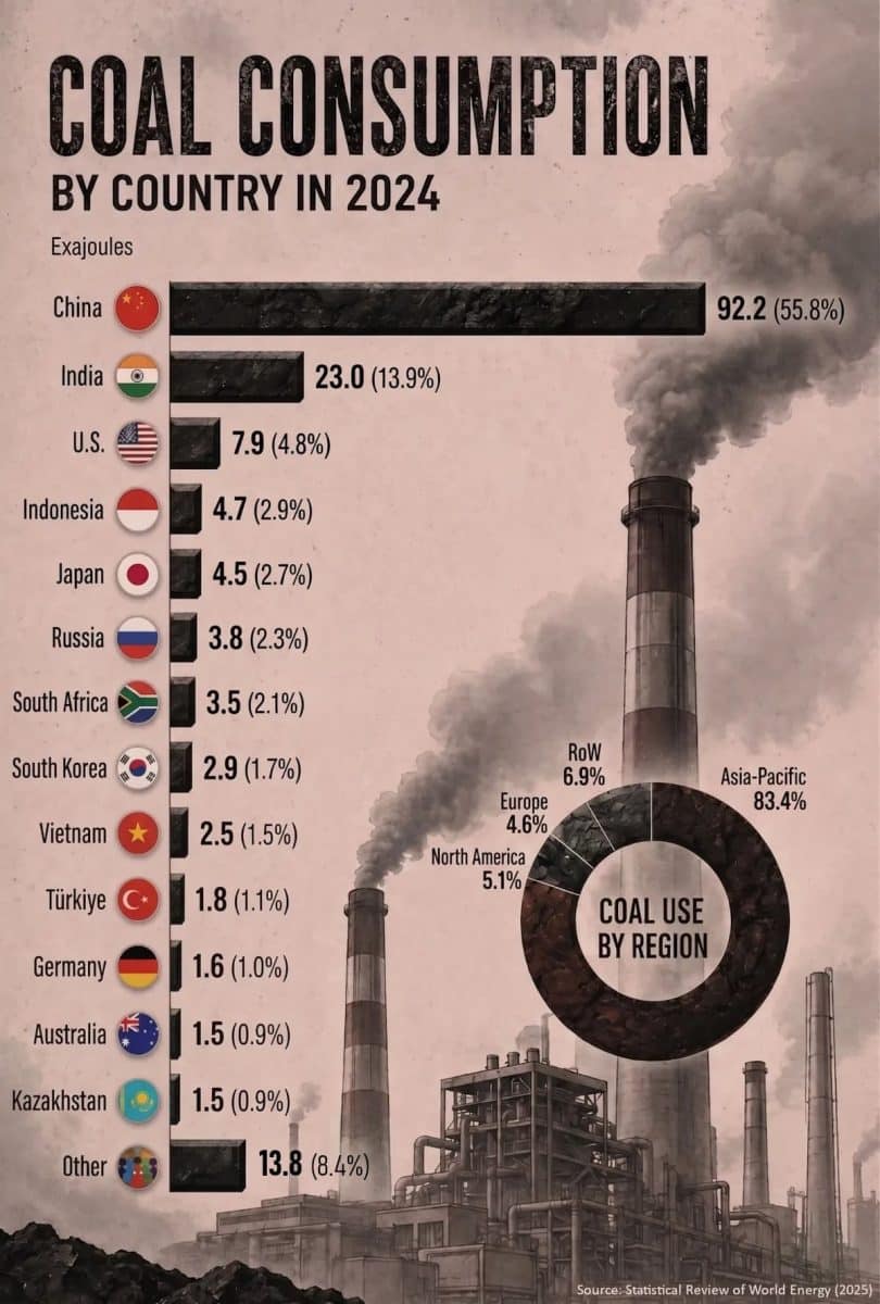 Инфографика выше, основанная на данных отчета Statistical Review of World Energy 2025, показывает крупнейших потребителей угля и демонстрирует, как спрос распределяется между ведущими экономиками мира.