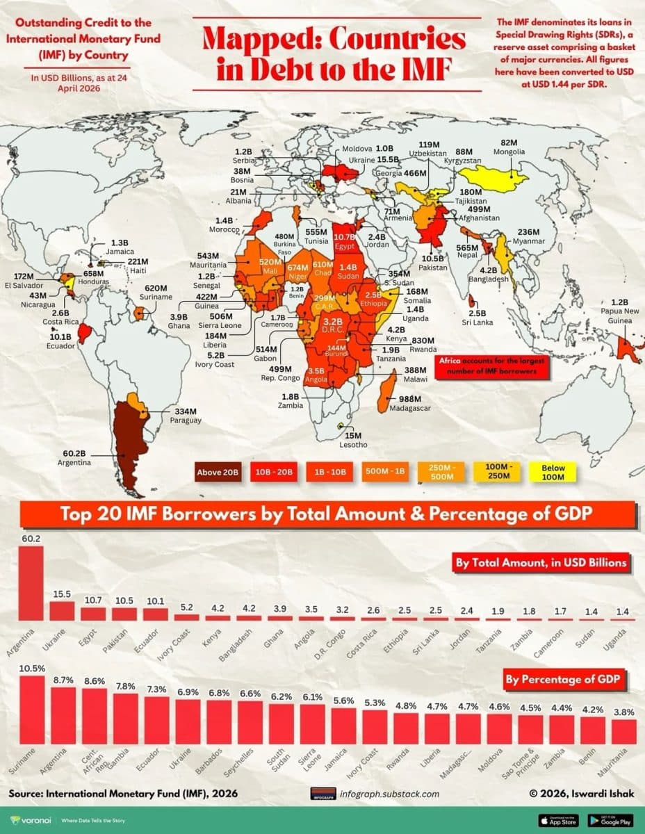 Новая инфографика, созданная на основе данных МВФ, показывает объемы непогашенных кредитов фонда по странам по состоянию на апрель 2026 года.
