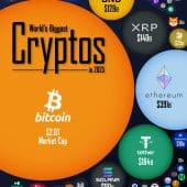 Биткоин — самая популярная, но не единственная криптовалюта. На инфографике представлены крупнейшие криптовалюты мира по их рыночной капитализации — общей стоимости всех выпущенных токенов.